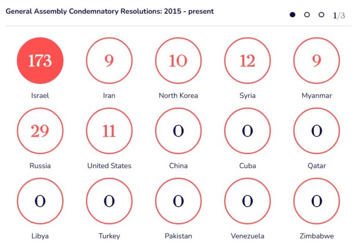 via de media worden we vrijwel voortdurend gebombardeerd op een enorme stroom aan negatieve Israël berichtgeving. Als je die berichtgeving allemaal moet geloven kun je niet anders dan tot de conclusie komen dat Israël zo’n beetje de grootste schurkenstaat op aarde is. Ook de VN is verworden tot een corrupte organisatie en voert een politieke oorlog tegen Israël, zie in de afbeelding hierboven de absurde hoeveelheid veroordelingen van dat land, terwijl gezwegen wordt over de echte misdaden die zich in islamitische staten afspelen.