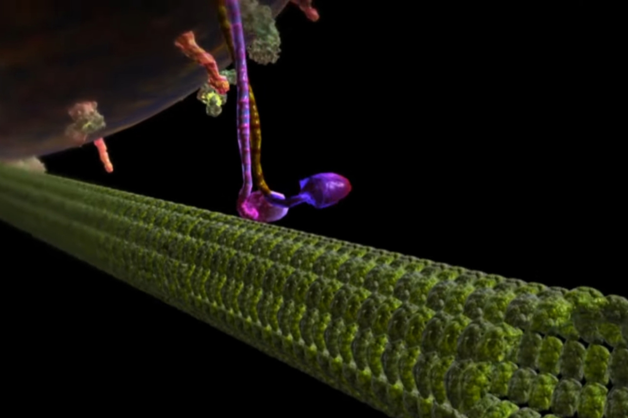 Het filmpje waar ik het over heb, laat één van die wonderbaarlijke systemen zien: de kinesine, een moleculaire robot die letterlijk “loopt”. De kinesine is verantwoordelijk voor het vervoer van essentiële onderdelen binnen de cel. Maar dat doet hij niet zomaar. Hij wandelt met twee minuscule “voetjes” over een netwerk van eiwit-snelwegen die speciaal voor dit transport worden gebouwd.