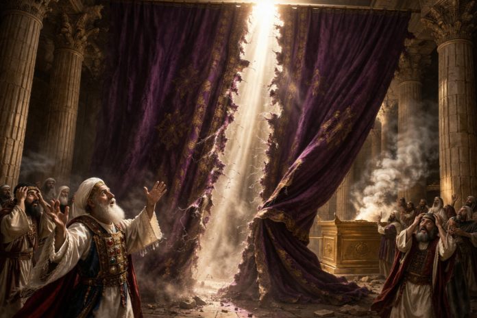 In de tempel in Jeruzalem hing een dik, zwaar gordijn tussen twee ruimtes: het Heilige en het Allerheiligste. Het Allerheiligste was de plaats waar God aanwezig was. Niemand mocht daar zomaar binnenkomen. Alleen de hogepriester mocht er één keer per jaar naar binnen, op de Grote Verzoendag (Jom Kippoer), om offers te brengen voor de zonden van het volk. Het gordijn symboliseerde dus een scheiding tussen God en de mens. Het maakte duidelijk: God is heilig, en de mens is dat niet.